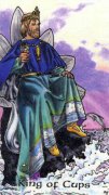 在圣杯国王牌中,我们能看到一位金发的头戴三叉戟王冠的国王,坐在一个用灰色石头雕刻的莲花形状的王座上。他的脖子上戴着一条金色的鱼项链,手中拿着金色的杯子,杯子上还印有太极的符号。在他身后,一只海豚在紫罗兰色的天空下跃出海洋。